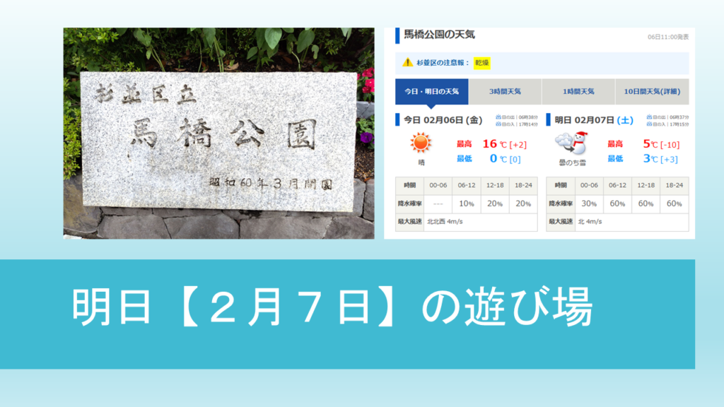 ということで、明日【2月7日・土】の杉並冒険遊び場☆のびっぱひろっぱは、馬橋公園で開催予定です。
